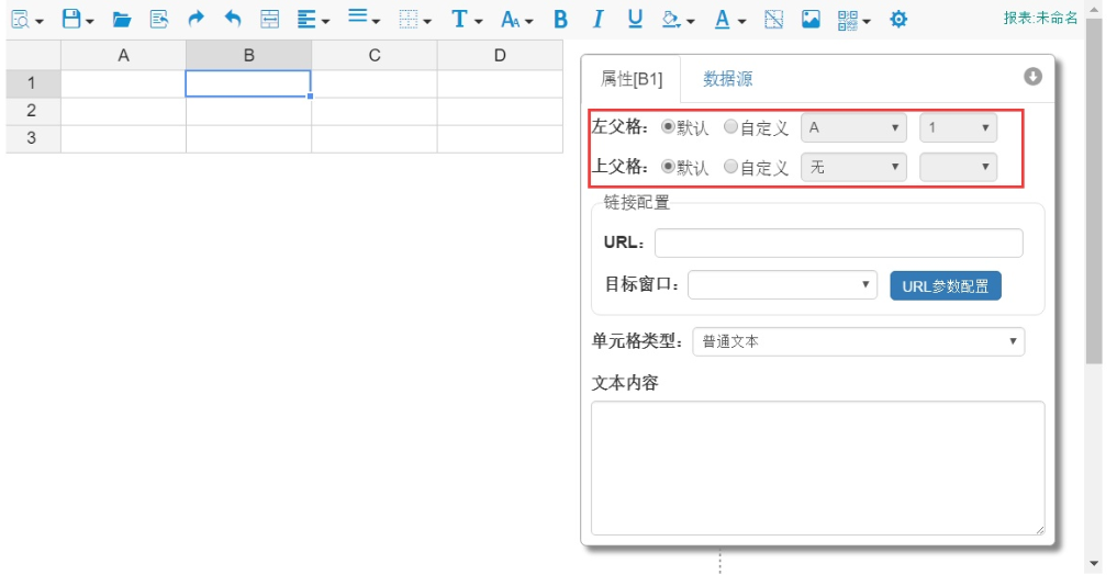 单元格之间存在依赖关系,对于任意一个单元格都可以设置它的左父格与上父格。单元格父格是可选的,默认情况下,单元格的左父格就是其最近左边与其位于同一行的单元格;上父格则是其最近上方与其位于同一列的的单元格。如果一个单元格位于第一行,那默认它就没有上父格,同样,如果位于第一列,默认它就没有左父格。打开报表设计器,选中任意单元格,都可以在其属性面板看到它的默认上父格或左父格,如下图所示:
